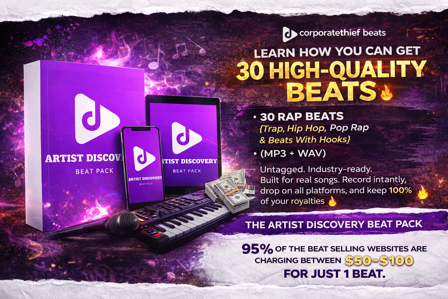 Promotional graphic for The Artist Discovery Beat Pack Bundle Offer by Corporatethief Beats, showing music production materials, digital devices, $20 and $10 bills, and bonus items, all for $27. Text highlights deal details.